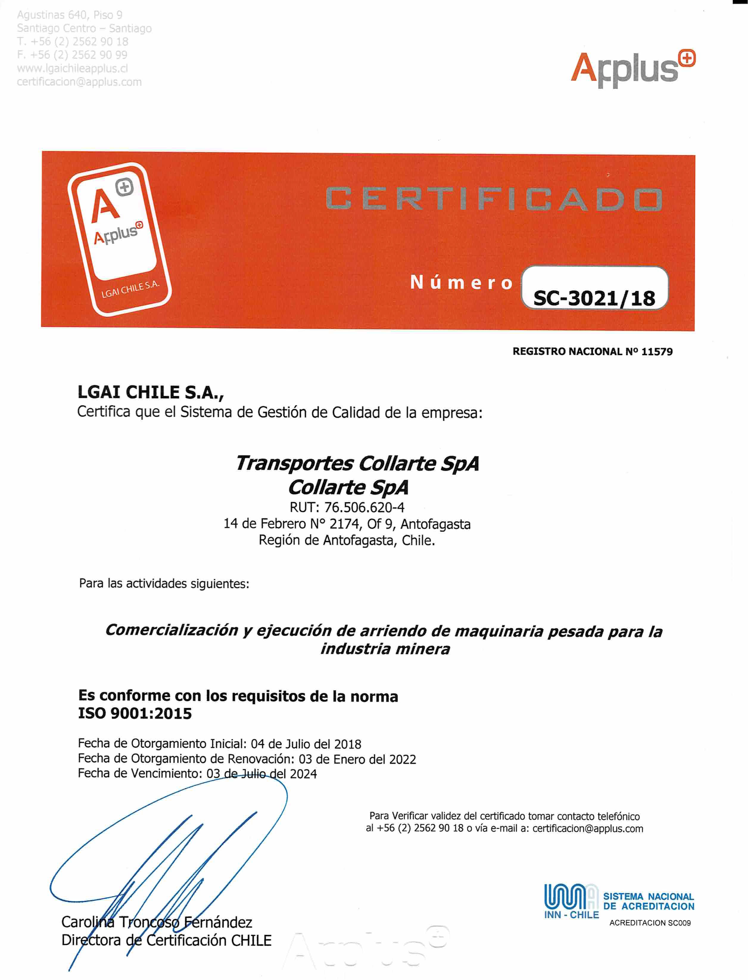 Nuestro compromiso con satisfacer las expectativas de nuestros clientes y de mejorar continuamente nuestros procesos internos ha sido ratificado con la obtención de la certificación de Calidad de nuestro proceso principal “La Ejecución del Servicio de Transporte y Carga de Materiales” bajo los estándares de las Normas Internacionales ISO 9001:2015 con la aprobación de la firma certificadora APPLUS. Nuestra certificación acredita que nuestra organización lleva a cabo los siguientes procesos: