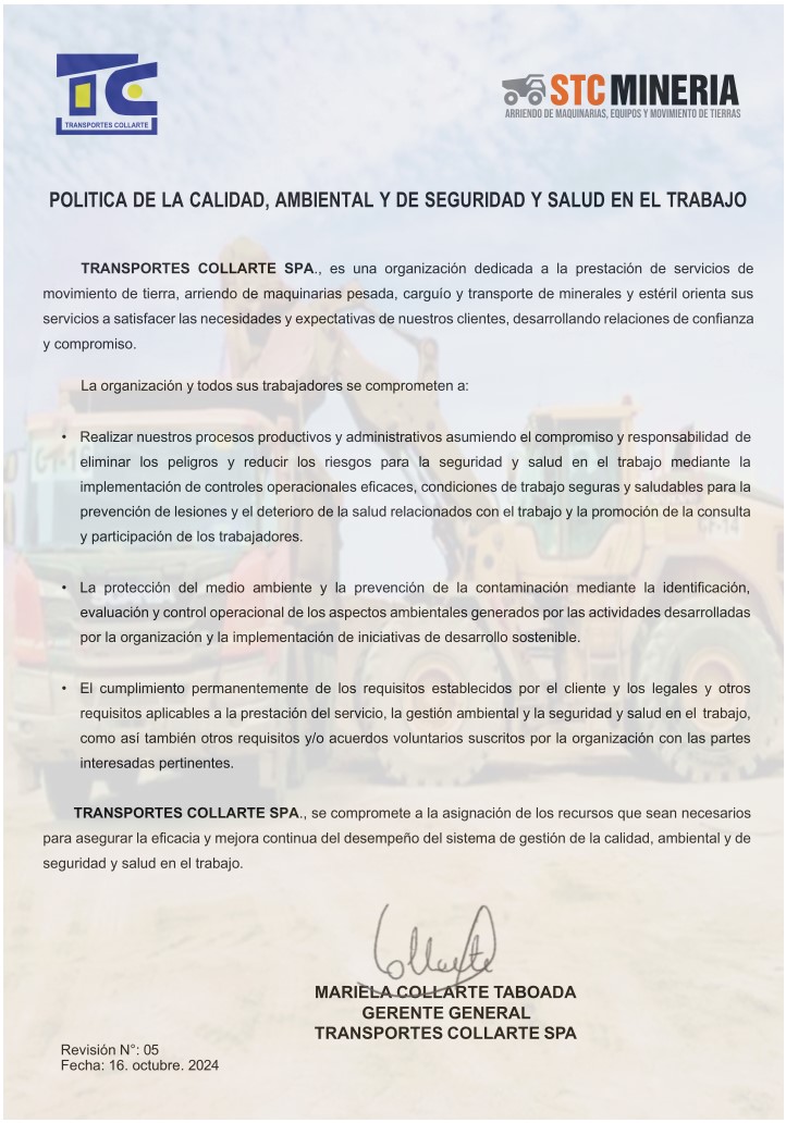 En STC Minería empresa dedicada a la prestación de arriendo de maquinarias, servicio de carguío y transporte de minerales estamos comprometidos con la implementación y mejora continua de nuestro Sistema de Gestión de Seguridad y Salud Ocupacional:
